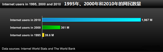 现在全世界大约有20亿互联网用户。2000年,全世界有3.61亿用户。再往前追溯,你会发现在1995年,全世界只有不到4千万用户。现在的互联网用户基数多于1995年的50倍,现在Facebook的用户是1995年整个互联网的用户的15倍。
