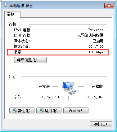检查本地连接设置的连接速度和全双工模式,有1.0Gbps选项,说明网卡和网卡驱动没问题