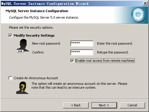 这一步询问是否要修改默认root用户(超级管理)的密码(默认为空),“New root password”如果要修改,就在此填入新密码(如果是重装,并且之前已经设置了密码,在这里更改密码可能会出错,请留空,并将“Modify Security Settings”前面的勾去掉,安装配置完成后另行修改密码),“Confirm(再输一遍)”内再填一次,防止输错。“Enable root access from remote machines(是否允许root用户在其它的机器上登陆,如果要安全,就不要勾上,如果要方便,就勾上它)”。最后“Create An Anonymous Account(新建一个匿名用户,匿名用户可以连接数据库,不能操作数据,包括查询)”,一般就不用勾了,设置完毕,按“Next”继续。