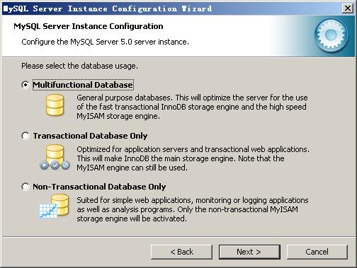 选择mysql数据库的大致用途,“Multifunctional Database(通用多功能型,好)”、“Transactional Database Only(服务器类型,专注于事务处理,一般)”、“Non-Transactional Database Only(非事务处理型,较简单,主要做一些监控、记数用,对MyISAM数据类型的支持仅限于non-transactional),随自己的用途而选择了,我这里选择“Transactional Database Only”,按“Next”继续。