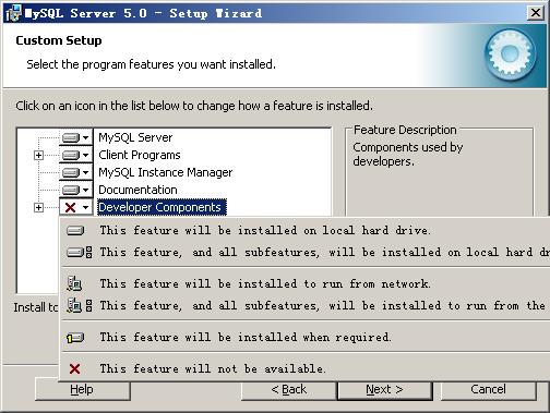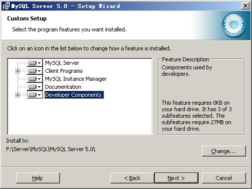 在“Developer Components(开发者部分)”上左键单击,选择“This feature, and all subfeatures, will be installed on local hard drive.”,即“此部分,及下属子部分内容,全部安装在本地硬盘上”。在上面的“MySQL Server(mysql服务器)”、“Client Programs(mysql客户端程序)”、“Documentation(文档)”也如此操作,以保证安装所有文件。点选“Change...”,手动指定安装目录。