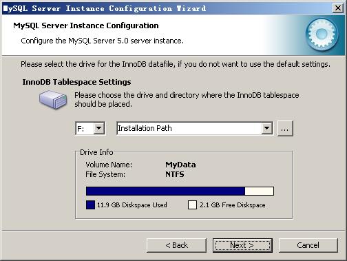 对InnoDB Tablespace进行配置,就是为InnoDB 数据库文件选择一个存储空间,如果修改了,要记住位置,重装的时候要选择一样的地方,否则可能会造成数据库损坏,当然,对数据库做个备份就没问题了,这里不详述。我这里没有修改,使用用默认位置,直接按“Next”继续