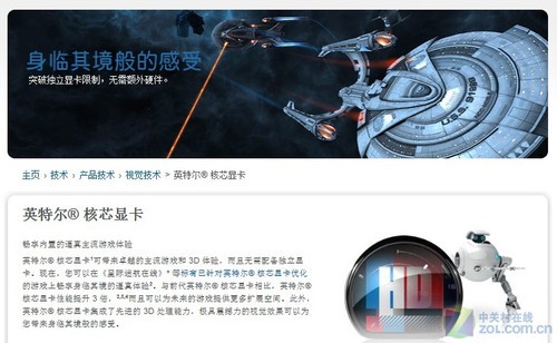 话说无利不起早,想必英特尔开发高性能的核心显卡也是耗费了大量的人力物力,那么它到底是想干什么呢?我们也许在英特尔自家的官网上可以看出一些端倪。请注意上述页面顶部图片中的那段标题:“突破独立显卡限制,无须额外硬件。”,英特尔的“狐狸尾巴”露出来了。