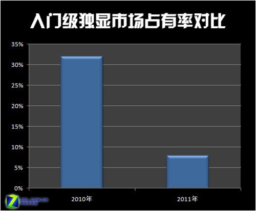 英特尔HD Graphic 3000的强势出击直接致使目前入门级独立显卡市场占有率大幅下降。据不完全统计,2010年的入门级独立显卡市场占有率大约在32%左右,而到了2011年,这个数字骤然下降到了8%左右。对于OEM厂商来说,在性能差距不大的情况下,已经很少有厂商会选择入门级独立显卡了。