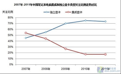 2010年中国笔记本电脑独立显卡关注比例为74.9%,而到了2011年这个数字下降到了73.4%,出现这种情况的原因我们姑且先不说,在下面的文章中会详细讲到,我们首先来看一下结果,相信会出乎你的意料。
