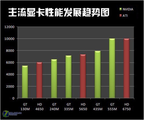 从近三年来主流移动显卡性能走势图中我们可以看到,从GT130M时代到GT435M时代,这期间每代显卡的性能提升大约都在10%左右,这也是多年来独显厂商产品发展的一个规律。通常按照这个规律来推算,当前主流的独显应该是GT540M或者HD 6550这个档次的产品,不过我们发现现在市面上的很多主流价位笔记本已经开始采用GT555M和HD6750这类独立显卡,而它们也是代替了之前的产品成为了新的主流移动级独立显卡。