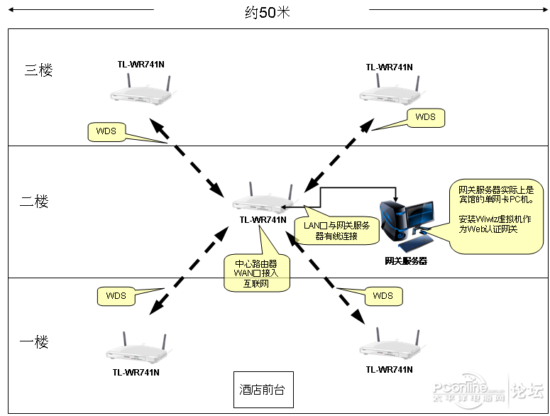 不久前在北戴河为某宾馆做的无线覆盖方案。效果不错,而且成本非常低廉。设备仅使用5台TP-LINK无线路由器。特此分享。