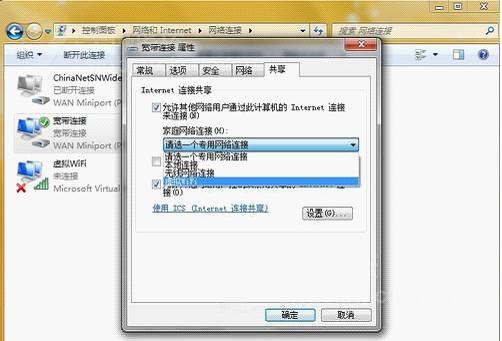 在“网络连接”窗口中,右键单击已连接到Internet的网络连接,选择“属性”→“共享”,勾上“允许其他······连接(N)”并选择“虚拟WiFi”。