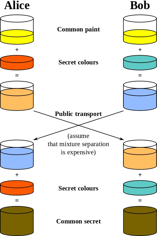 请注意图中一开始的颜色(黄色)最后都会有Alice和Bob的颜色参与计算。这就是双方会得到同样结果的原因。对于观看中间过程的人来说,唯一在连接中发送的半合成信息是毫无意义的。