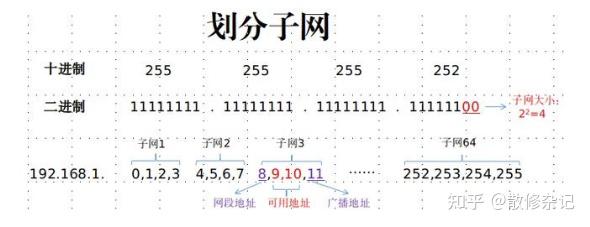 当然上面是默认的情况,也是最简单的情况。下面我们分析子网掩码255.255.255.252是怎么划分子网的。将该子网掩码转换成二进制为30个1和2个0,表示每个子网中只有4个IP地址(2的2次方),192.168.1.0-255的地址段共可划分64个子网,第一个子网的地址范围是192.168.1.0-192.168.1.3,第二个子网的地址范围是192.168.1.4-192.168.1.7,依次类推。其中每个子网第一个和最后一个IP地址不可用,可用的只有2个IP地址。也就是说:如果子网掩码设置为255.255.255.252,那么该子网只能容纳两台电脑,而且这两台电脑的IP必须在一个子网内才能正常联网,例如一台电脑的IP设为192.168.1.10,另外一台电脑的IP必须设置为192.168.1.9。