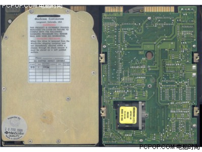 从图中的电路板中我们明显感到,3.25英寸硬盘电路板中的芯片集成度已经有了长足的进步。这款迈拓8051A事实上是被其收购的Miniscribe生产的,推算它的生产日期应该在1991年之后了。该硬盘具备40MB容量,32KB缓存,以及28ms平均存取时间。