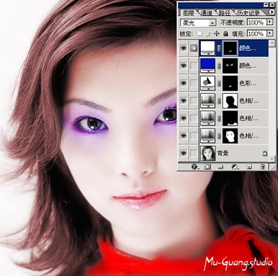 你还可以再添加其它效果,如唇彩,眼影等。另外你还可以建立其它类型的调整图层对图片进行处理,具体效果还是自己试验一下吧。加眼影: