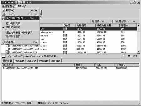 建议在安装完Windows后,点击“开始→程序→附件→系统工具→系统信息”,在打开的“系统信息”窗口中再点击“软件环境→正在运行任务”(在此进程列表中,可看到更详细的属性,其中程序路径是非常重要的信息),接着点击“操作→另存成文本文件”,以后系统出现异常时则对照进行分析。另外,“优化大师”也提供了保存进程快照的功能●。