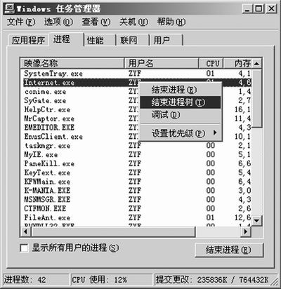第三步:在尝试结束进程时,第一次选择“systemtray.exe”来结束进程树,结果进程马上就再生了,任务管理器中又显示出这两个进程!于是再次选择“internet.exe”,然后结束进程树●。进程没有再生,从而将木马进程从系统中清除。