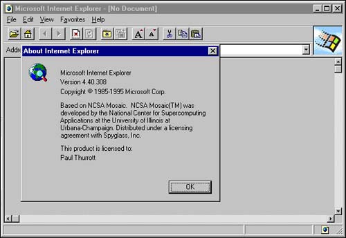 这个其貌不扬功能简陋的IE 1.0只是基于NCSA Mosaic的简单"修改版"。没有增加太多的新特性,不支持Java,不支持插件,浏览速度也很缓慢。Netscape浏览器还没有把这个小家伙看在眼里,据说当年给IE1.0做研发工作的只有几个人而已。