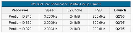 而面向桌面高端的Pentium eXtreme Edition则推出了840(3.2GHz)以支持双核心 。它的基本规格与Pentium D类似,但其FSB提升到1066MHz,并且带有4线程TLP形式的Hyper-Threading,核心面积206平方毫米,集成2亿3000只万晶体管。上市之初Pentium EE 840的销售价格将达到999美元。