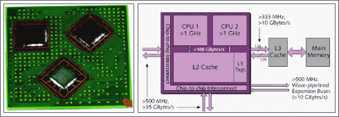 首先开始采用单芯片双核心设计并不是今天Intel、AMD而是蓝色巨人IBM,为了巩固其Power系列RISC处理器与服务器市场的霸权,IBM在1999年10月微处理器论坛中,率先揭露了其双核心Power4的研发计划,其采用180nm铜导线搭绝缘硅(SOI)制程,于2000年元月开机成功,时钟频率冲上1.3GHz,随即引爆了整个业界对双核心以致于多核心处理器发展的关注。IBM Power4也夺得微处理器论坛主办机构Micro Design Resource的1999年最佳创新技术奖项。