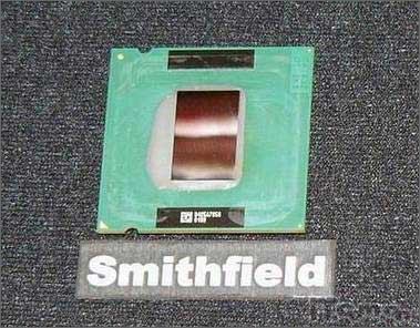 Pentium D核心代号为Smithfield,采用90纳米工艺设计,总线频率为800MHz。从物理结构上看Pentium D处理器也使用了LGA775型接脚,其物理形式与Pentium4 5系列和6系列相同,但对应核心位置的处理器底部贴片电容元件数目有所增加,排布方式也发生了变化。标称L2 Cache容量为2MB,但这2MB的L2 Cache跟Pentium4 6系列的2MB并不相同,它是每个核心各分得独享的1MB的L2 Cache,如果一个核心需要存取另一个核心的L2 Cache内的数据则需要借助MCH来完成。