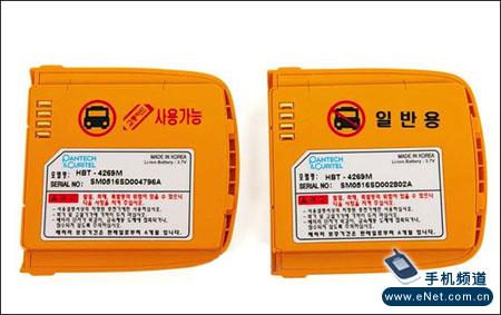 HS8000配备有交通卡电池和一般电池。两种电池的容量是一样的,不过何为交通卡电池呢?原来交通卡电池就是当用户使用移动金融卡时,所使用的一种专门的电池。我们都知道韩国本地的手机是没有专门的UIM卡插槽。但是韩国却把手机银行等相关的手机金融功能设计成了卡的形式,其使用方式就如同我们国内的UIM相同。把卡片插到手机里就可以实现手机银行功能。而HS8000的普通电池可能就是把卡的信号给卡断,致使两个电池虽然容量相同,但是功能却有不同。