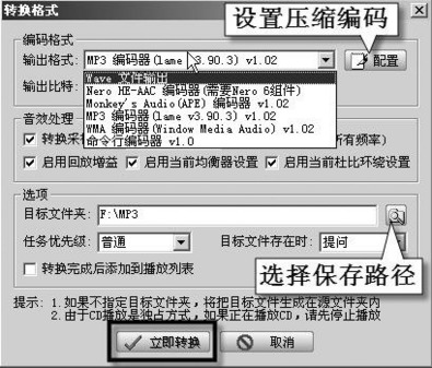 用千千静听打开CUE文件后,在其“播放列表”窗口中会显示出APE文件的播放列表,用鼠标选取你要转换的曲目(可同时使用Ctrl键或Shift键配合鼠标进行多选),选中的文件会变成蓝色。然后用右键单击选中的文件,在右键菜单中点击“转换格式”选项(如图1),弹出“转换格式”面板,将“输出格式”选为MP3格式,点击“配置”按钮,在“MP3编码选项”对话框中设置MP3的编码率。在“目标文件夹”框中设置文件保存路径,最后点击“立即转换”按钮即可将选中的APE曲目转换为单个的MP3文件了(如图2),会弹出“正在转换格式”窗口显示转换进度。