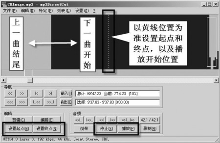 首先安装mp3DirectCut软件,它是一款MP3文件切割工具,可以准确的分析出MP3文件的波形并用图形显示出来,使你能对MP3文件进行精确分割。先用千千静听播放器打开APE文件,用右键单击它选择“转换格式”选项,将它转换为MP3文件。然后用mp3DirectCut打开转换后的MP3文件,在软件界面上部会显示出巨大的波形图形,此时用鼠标慢慢拖动下方的滑块,仔细观察图形,你会发现每隔一段就会出现一段空白和一个长方形阴影区域。空白区域是上一首歌曲的结尾部分,而长方形阴影区域则是下一首歌曲的开始部分,这样你就可以精确的找到每首歌的开始和结尾部分了。点击“播放”按钮可以从波形图中的黄线位置开始播放歌曲,找到你要提取的歌曲后,再以黄线为标杆分别在歌曲开始和结尾部分点击“设置起点”和“设置终点”按钮,选中的区域会被点亮(如图3)。然后点击“文件”/“保存选区”选项,弹出“创建音频文件”对话框,输入文件名和保存路径后,点击“保存”按钮即可将选中的区域保存为单独的MP3文件了。