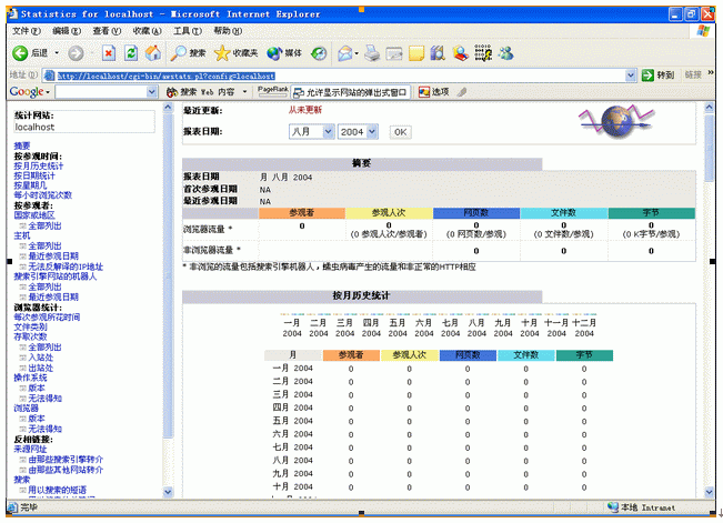 awstats.pl -config=myvirtualhostname -update 该命令生成新的日志记录,打开浏览器访问http://www.myserver.mydomain/cgi-bin/awstats.pl?config=myvirtualhostname即可观测到服务器迁移至本地的IIS日志分析报告;