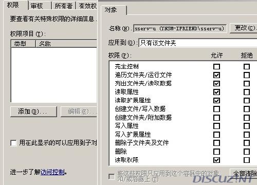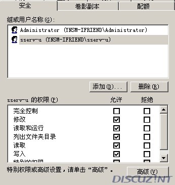 假设你有一个WEB目录,路径是d:web。那么在这个目录的“安全设定”里除了管理员和IIS用户都删除掉,再加入SSERVU账号,切记SYSTEM账号也删除掉。为什么要这样设置呢?因为现在已经是用SSERVU账号启动的SERV-U,而不是用SYSTEM权限启动的了,所以访问目录不再是用SYSTEM而是用SSERVU,此时SYSTEM已经没有用了,这样就算真的溢出也不可能得到SYSTEM权限。另外,WEB目录所在盘的根目录还要设置允许SSERV-U账号的浏览和读取权限,并确认在高级里设置只有该文件夹。(见图14)