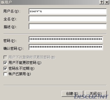 下面就到了该对SERV-U进行安全设置的时候了。首先建立一个WINDOWS账号SSERVU,密码也需要足够的复杂。密码要记住,如果记不住就暂时保存在一个文件里,一会儿还要用到。(见图8)