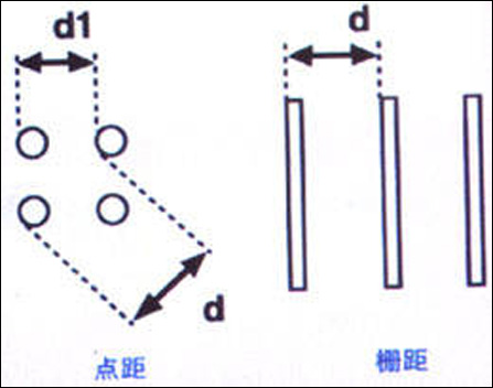 在传统的CRT显示器中,分为荫栅式与荫罩式的荧光屏的点排列(即一般的柱面与球面显示器),这两者的点距定义是不一定的,如下图所示。相同尺寸的CRT显示器的点距会因为荫罩或光栅的设计、视频卡的种类、垂直或水平扫描频率的不同而有所改变,是可以不一样的。