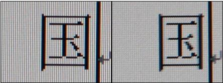 在下面放大之后的对比照片大家可以看到,“国”字在竖立的笔划下有部分点距成像错了。所以,大家在使用液晶显示器时,最好还是调至最佳分辨率的状态下使用。