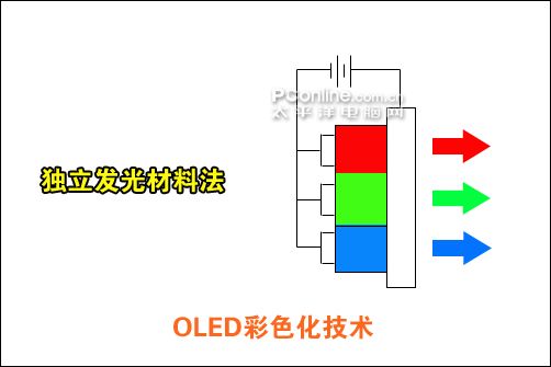 独立发光材料法:顾名思义是以红绿蓝三色为独立发光材料进行发光,是目前OLED彩色化最常用的工艺方法。