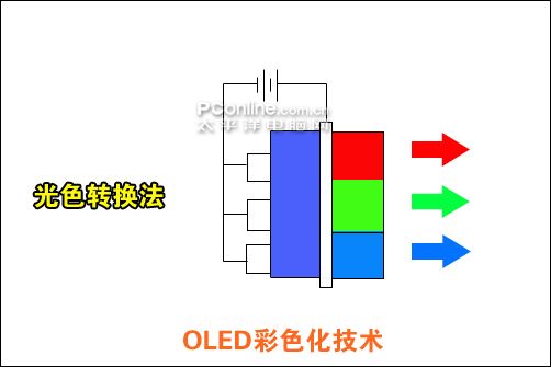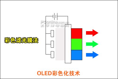 彩色滤光膜法:有些类似LCD,采用白色光源透过类似LCD的彩色滤光片来达到全彩的效果。