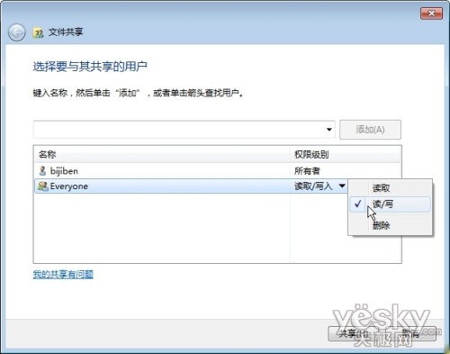 我们以将一台电脑的E盘根目录下的Share文件夹进行共享为例。首先鼠标右键单击E盘根目录下的Share文件夹,选择“属性→共享”。然后在打开的对话框中单击“共享”,在弹出的对话框中选择用户名为Everyone,再单击“添加”,让它出现在下面的列表框中。接下来在“权限级别”下为其设置权限,比如:“读/写”或“读取”(如图)