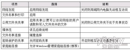 在Win 7中设置家庭网络,可以在控制面板中打开“网络和共享中心”,单击“选择家庭组和共享选项→更改高级共享设置”即可对“家庭和工作”和“公用”两种局域网环境进行设置。展开“家庭和工作”网络,必须选择的项目如下表。