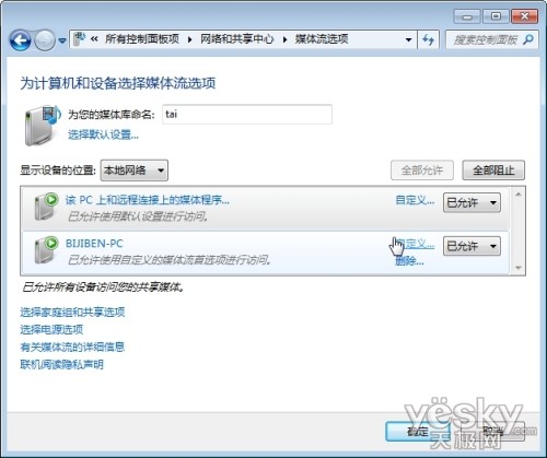 上述设置完成后,再次进入“网络和共享中心”下的“媒体流选项”窗口,就可以观察到已加入的计算机名,单击网络中的电脑后的“自定义”链接(如图)。从弹出的对话框里显示的内容看,它将不对媒体共享进行任何限制。下面我们就开始对其进行修改。