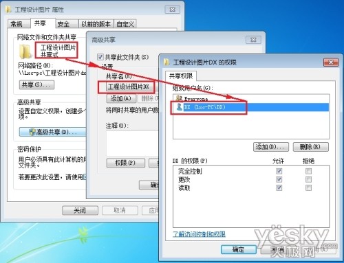 然后就是分别对两个账号进行权限设置。在文件夹的“共享”选项中选择“高级共享→共享此文件夹”,在“共享名”下输入一个名称(如“工程图片DX”),再单击“权限→添加→高级→立即查找”,找到刚才创建的账号“DX”并单击即可将其添加进来。最后勾选“允许”下的“完全控制”(如图)