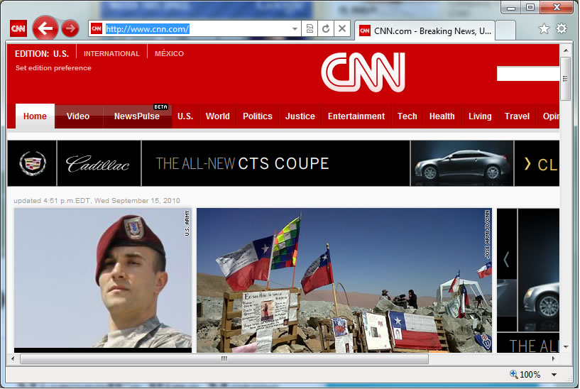 点击CNN图标打开pinned site,用户可以看到窗口左上角明显看到CNN的网站图标,浏览器的“前进”、“后退”按钮颜色变成了CNN网站的主色调-红色。 由此让用户产生感觉是:我在用CNN.com , 而不是在用IE浏览器。 网站是主角。
